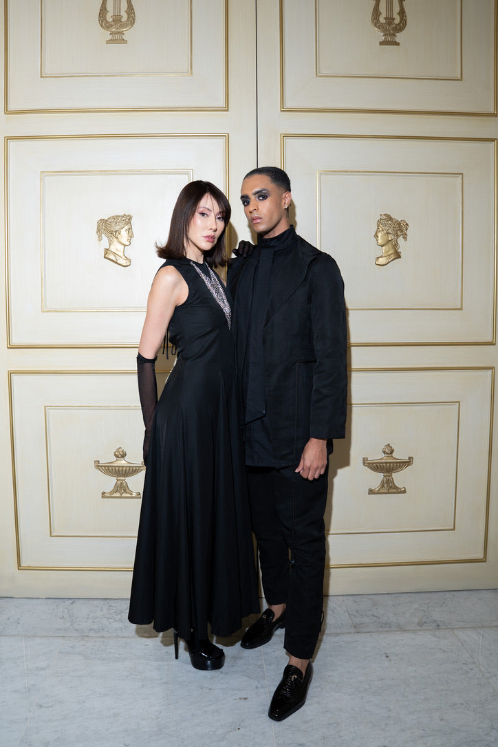 Tsuya Essence Dress のデザインについて Tsuya Essence Dress は、人が本来持つ根源的な欲望をテーマにした一着です。なかでも、背面のデザインにその象徴を込めています。 背中に施した丸みのある開きは、仏教における三つの欲の世界を表現したものです。 この曲線によって、欲望を過剰なものとしてではなく、自らの内にあるものとして静かに見つめる感覚をかたちにしました。